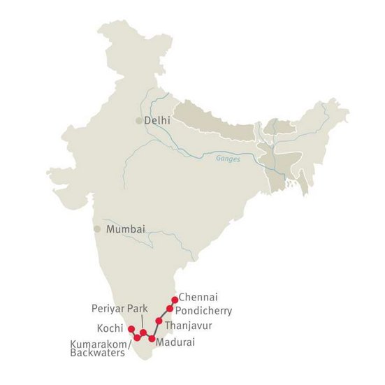 Ce circuit englobe les principales curiosités des Etats du Tamil Nadu et du Kerala. Le mélange bien équilibré de culture et de nature fait de ce programme la visite idéale pour celles et ceux qui viennent en Inde pour la première fois.