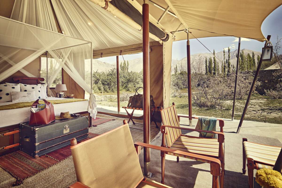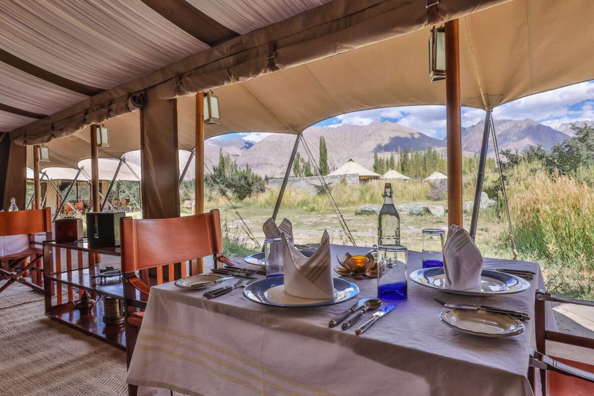 Une route panoramique vous emmène sur la plus haute route praticable du col de Khardung- La, à 5359 m, dans la vallée de la Nubra. Le paysage est caractérisé par des oasis avec des peupliers, des saules, des rosiers, des pommiers et des abricotiers. Le contraste est formé par les dunes de sable blanc et les pics rocheux des montagnes du Karakorum. Votre hébergement idyllique pour les trois prochaines nuits sera le Chamba Camp à Diskit.