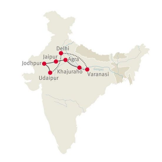 Laissez-vous initier aux secrets de l'Inde - découvrez le Taj Mahal, l'état désertique du Rajasthan ainsi que la ville sainte de Varanasi et les temples ornés de Khajuraho. Attendez-vous à vivre un voyage unique avec d'innombrables délices.