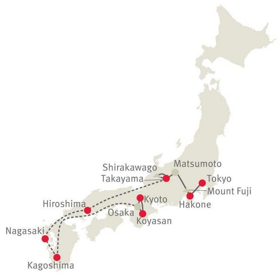 Ce circuit complet et parfaitement conçu promet une expérience de première classe à travers le pays du soleil levant. Un voyage riche en moments forts, dont la diversité est difficilement égalable, accompagné d'un guide expérimenté parlant allemand.