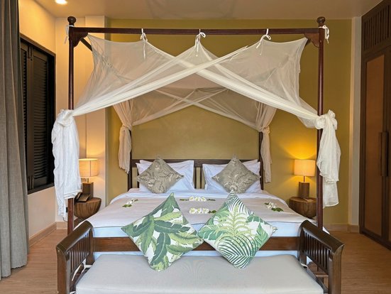 • 91-100 m², villa, rez-de-chaussée, 1 chambre à coucher séparée, salle de bain semi-ouverte, douche, baignoire, WC, peignoir, sèche-cheveux, miroir cosmétique, climatisation, ventilateur, minibar payant, coffre-fort, TV (TV câblée, chaînes locales, TV par Internet, écran plat), système audio, café/thé, terrasse (meublé), jardin, piscine privée