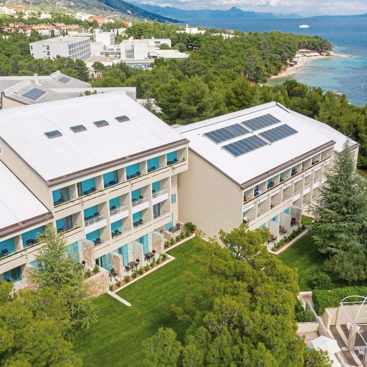 - L'hôtel se compose de plusieurs pavillons construits en pierres blanches typiques de la région, regroupés autour de la piazzetta à la manière d'un village croate.