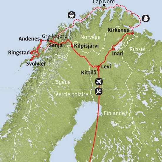 Les routes peu fréquentées du Nord de la Scandinavie offrent des vues magnifiques sur les vastes paysages. Vous allez souvent croiser la route des rennes. Durant les trois jours à bord du bateau postal, vous pouvez admirer le paysage qui défile depuis le salon panoramique ou depuis le pont et vous détendre. De pittoresques villages de pêcheurs devant des montagnes escarpées vous attendent sur l’archipel des Lofoten. Lors d’une excursion d’une journée, vous découvrez ces îles à votre rythme avant de passer par la spectaculaire île de Senja et par un tour à travers les immenses étendues de la Laponie.