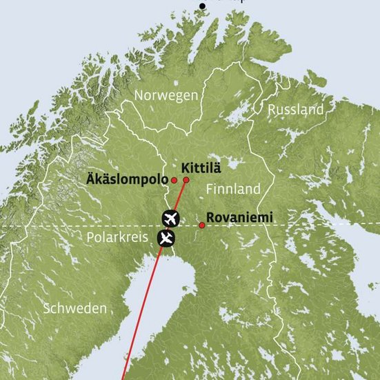 Vol direct pour Kittilä et prise en charge de votre voiture de location. Trajet de 45 min jusqu'à Akaslompolo.