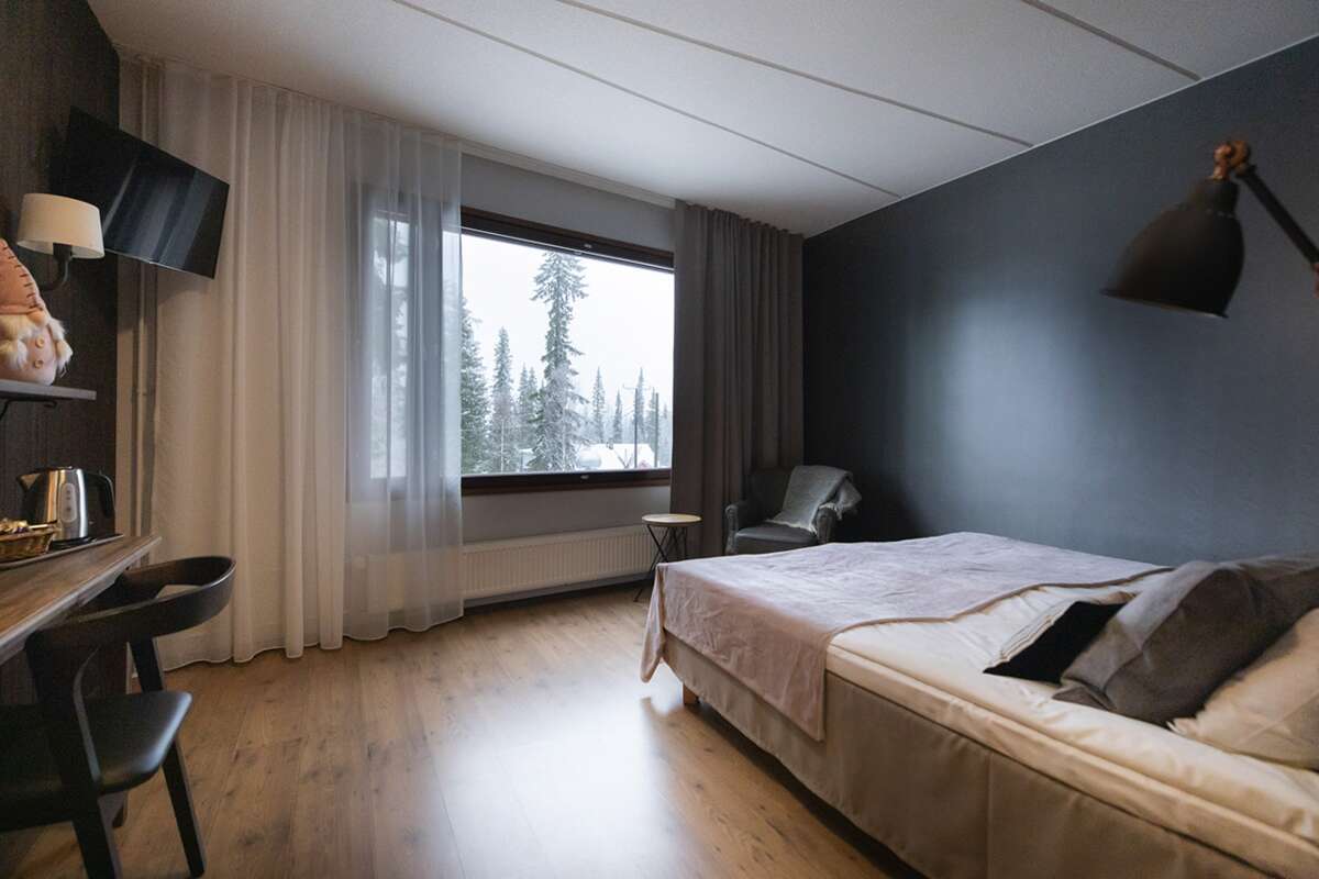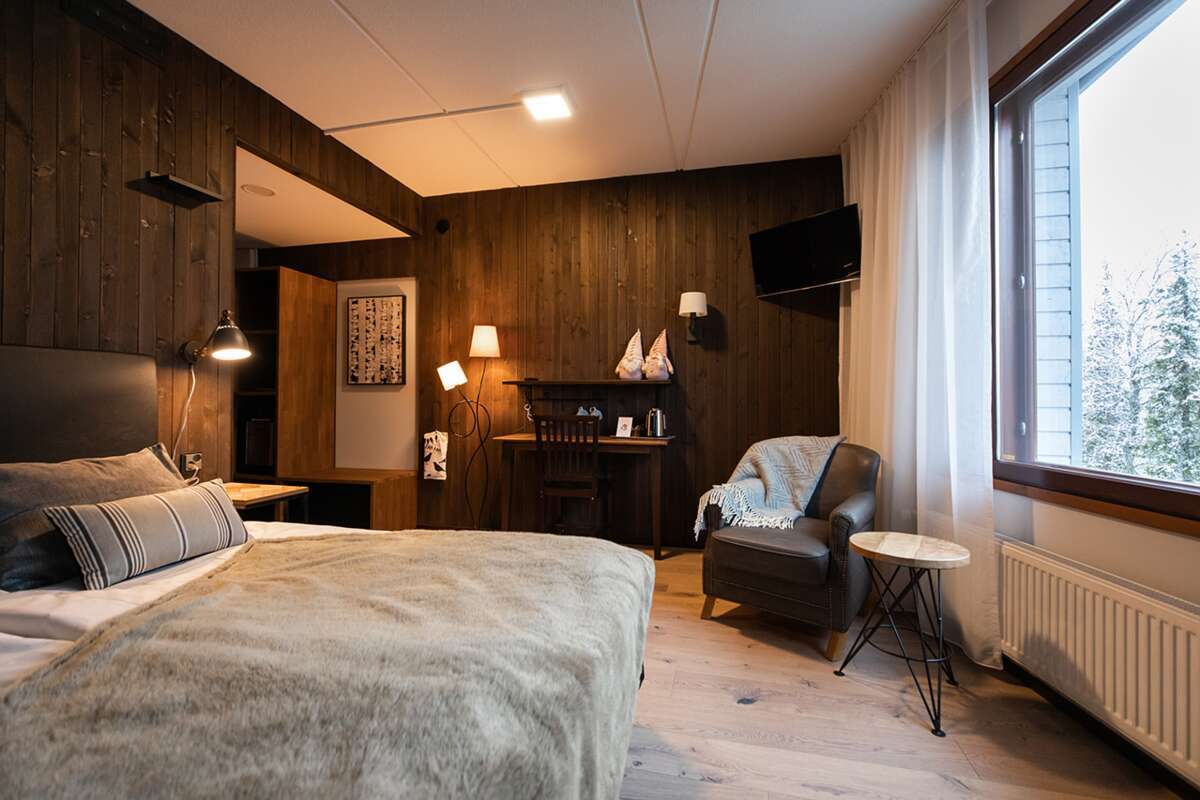 Les 30 chambres confortables sont équipées de deux lits séparés, douche/WC, sauna individuel, TV/téléphone et accès internet. La literie est changée une fois par semaine. Quelques-unes disposent d’un poêle suédois (contre supplément). L'hôtel propose également un confortable bar dans le lobby avec cheminée et un très bon restaurant qui sert avant tout des produits locaux.