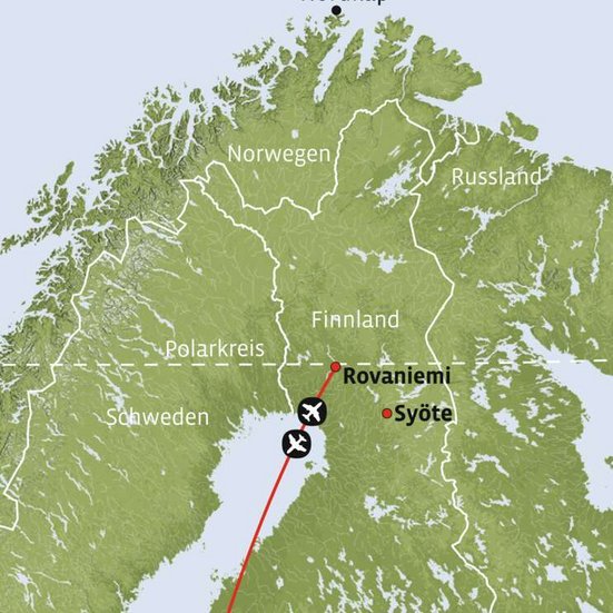 Vol direct pour Rovaniemi et prise en charge de la voiture de location à l'aéroport. Vous roulez en direction du sud vers le village de Syöte et le "Arctic Hilltop Boutique Hotel Iso-Syöte". Le trajet dure environ 2h30.