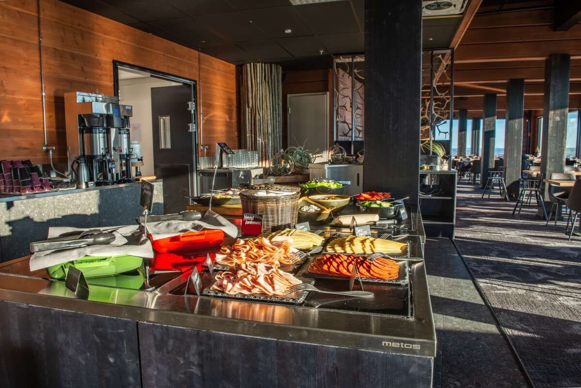 Le spacieux restaurant panoramique sert d'excellents plats.