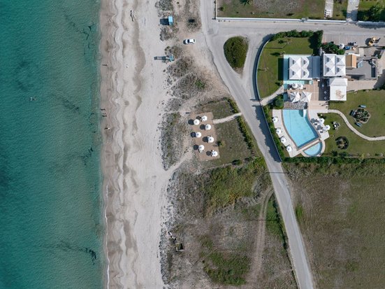 - plage de sable/galets : à l'état naturel, séparé du complexe par une route, parasols, transats