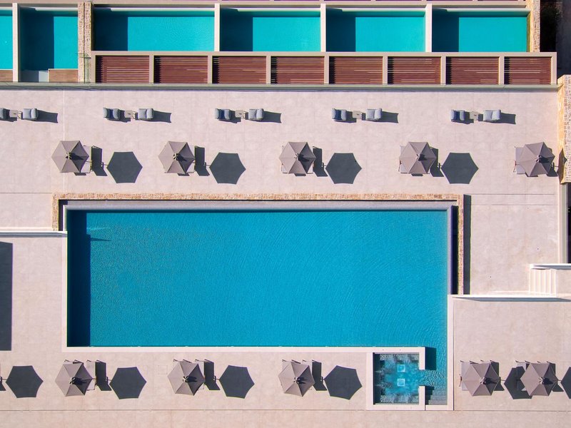 - 1 piscine : piscine à débordement, parasols, transats, serviette de bain