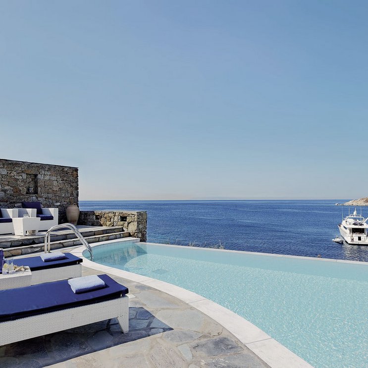 Légèrement surélevé sur une presqu'île, l'hôtel offre une vue spectaculaire sur la mer Égée. Ce rêve en blanc et bleu promet des vacances relaxantes dans une élégance intemporelle avec un confort et un service fabuleux.