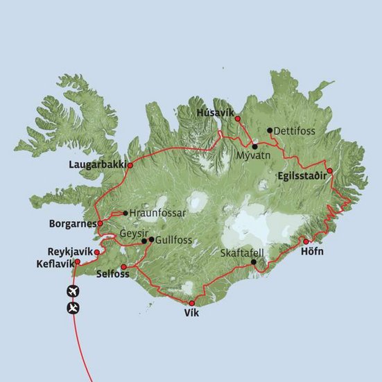 La visite du "Cercle d'or" vous permet de découvrir la chute d'or de Gullfoss, un geyser actif à Geysir et des sources thermales bouillonnantes. Vous visitez Thingvellir, le lieu historique le plus important d'Islande. Dans le parc national, la dérive des plaques continentales est visible de manière impressionnante sous la forme de fissures et de failles. Nuitée dans la région de Keflavík.