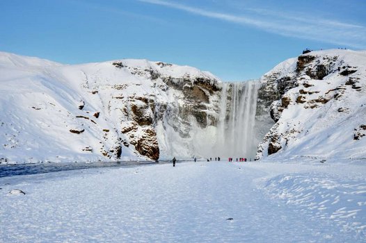 Départ en direction de la splendide côte Sud de l'Islande. Sur le trajet, vous vous arrêtez à l'étonnante chute de Seljalandsfoss puis à celle de Skogafoss, qui tombe d'une hauteur de 60 mètres. Vous passez ensuite par le cap Dyrholaey, qui surplombe l'océan et ses flots déchaînés et pouvez observer des arches et piliers noirs et ciselés. Sur les falaises, arches et pitons nichent de nombreux oiseaux de mer. Vous bénéficiez en cours de route d'une dégustation de requin séché et de brennivin (schnaps local). Enfin, vous vous promenez sur l'immense plage lunaire de sable noir de Reynisfjara qui s'étend à perte de vue. Le contraste des couleurs y est particulièrement frappant en hiver. Vous profitez ensuite d'un moment de détente dans l'eau naturellement chaude du lagon secret (location de serviette incluse).