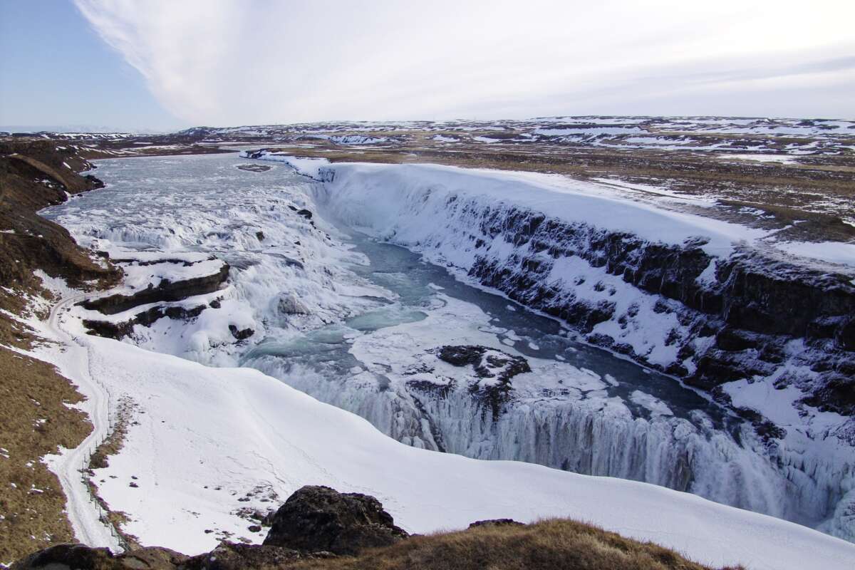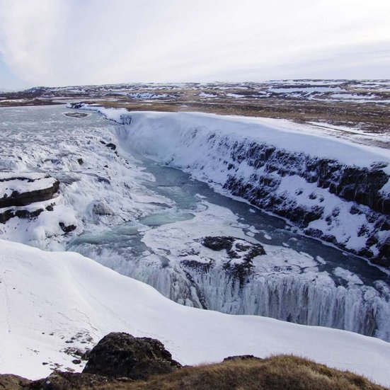 Vous commencez la journée par la visite du fameux Cercle d'Or. Vous vous arrêtez tout d'abord au Parc National de Thingvellir, «la vallée du Parlement », qui fut le berceau de la démocratie islandaise en l'an 930 et le premier parlement européen. Classé au patrimoine mondial de l'UNESCO, ce lieu est également intéressant sur le plan géologique car c'est ici que se séparent les plaques tectoniques de l'Europe et de l'Amérique. Vous explorez ensuite le site des geysers où le Strokkur émet une colonne d'eau chaude de 20 mètres de haut toutes les 7-10 minutes environ. Enfin, vous apercevez la magnifique chute d'or de Gullfoss, qui se précipite dans un profond canyon de basalte. Dans l'après-midi, place à l'aventure avec une excursion en motoneige d'une heure au départ de Gullfoss.