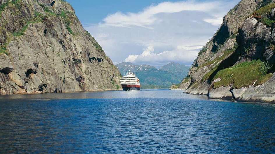 Cela vaut la peine de se lever tôt: vous longez la côte haute en couleurs et fertile du Helgeland et vous traversez le cercle polaire. Un paysage varié avec d'innombrables îles, montagnes et cascades se succède.