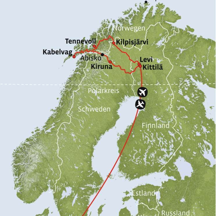Le voyage commence dans l'immensité de la Laponie, où le silence, les grands espaces et la culture Sami donnent le rythme – un sentiment de liberté à l'état pur. Le voyage se poursuit à travers les cols de montagne et la toundra nordique en direction de l'Atlantique, là où le paysage devient spectaculaire : les Lofoten. Avec trois nuits sur place, vous avez tout le temps d'explorer les chaînes de montagnes escarpées, les plages de sable blanc et les villages de pêcheurs sur pilotis, avant de retraverser la chaîne de montagnes à la frontière entre la Norvège et la Suède pour retourner en Finlande.