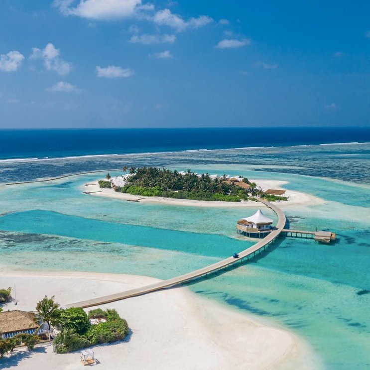 Les toits blancs éclatants des bungalows sur l’eau flottent dans le vent – un joli contraste avec le jeu de couleurs environnantes de vert et de bleu. La tranquillité paradisiaque et l’un des plus grands lagons peu profonds des Maldives promettent des vacances de détente.