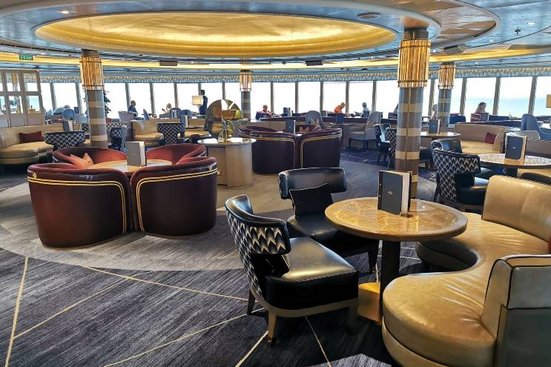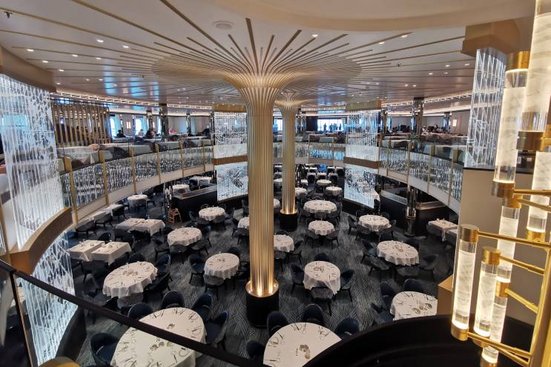 Le joyau du bateau est sans conteste le restaurant Britannia : avec ses colonnes dorées et ses éléments en verre scintillants, il dégage une atmosphère festive et élégante.
