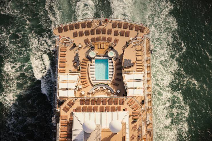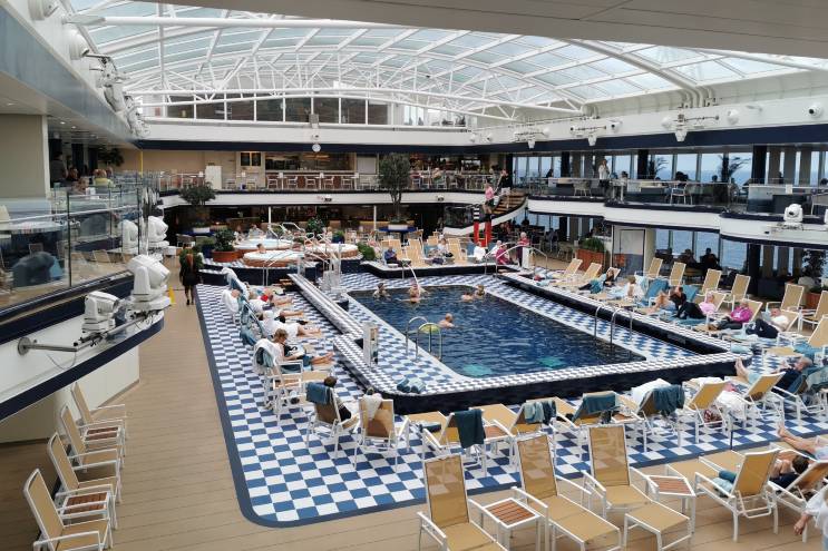 Il y a deux zones piscine : celle située à l’arrière du navire permet de profiter de la vue sur la mer à ciel ouvert. De nombreux transats sont répartis sur les ponts 9 et 10, et le bar Cabana Bar, situé sur le pont 11, est l’endroit idéal pour admirer le coucher du soleil. La deuxième piscine se trouve également sur le pont 9, au milieu du navire, et est recouverte d’une immense coupole en verre, ce qui permet de profiter de la piscine même par des itinéraires vers des contrées plus froides. Le Wellness Café, qui propose des alternatives saines pour le petit-déjeuner et le déjeuner, est une nouveauté dans cet espace.
