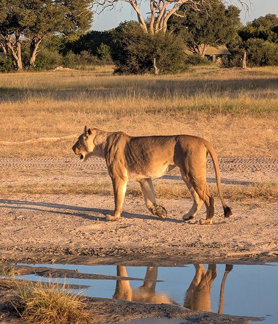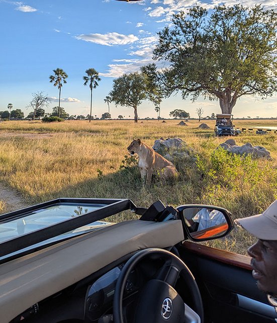 La célèbre cerise sur le gâteau nous attendait à la fin : alors qu'elle se dirigeait vers les hautes herbes, toute la famille est passée à moins de cinq mètres de notre véhicule. Un moment à vous donner la chair de poule ! Le dernier jour du safari, nous avons revu la famille. Les jeunes lions gambadaient joyeusement tandis que les plus âgés se reposaient au soleil. Un dernier éléphant nous a salués à la piste d'atterrissage avant que je ne reprenne l'avion pour Victoria Falls. De là, nous avons continué vers la Zambie. Lors d'une croisière safari au coucher du soleil sur le fleuve Zambèze, j'ai pu admirer de près des hippopotames, des crocodiles et d'innombrables oiseaux.