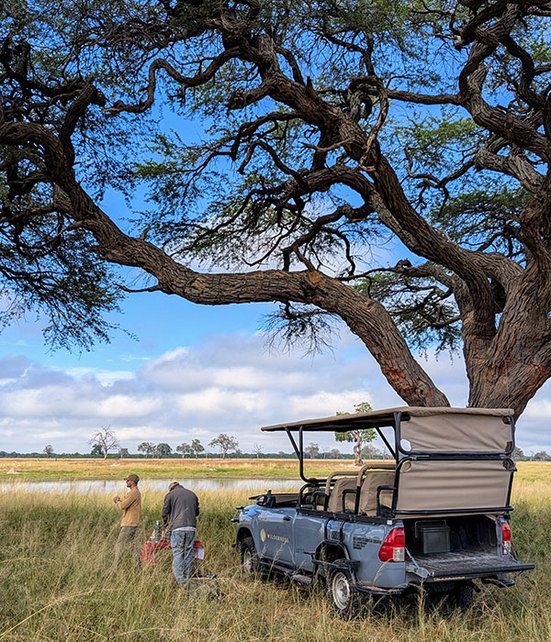 Pour beaucoup, les mots « Afrique » et « safari » évoquent immédiatement la Tanzanie, le Kenya ou le Botswana. Mais lors de mon voyage, j'ai pu découvrir que le Zimbabwe et la Zambie sont également des destinations qui valent le détour : des étendues infinies, des rencontres fascinantes avec des animaux sauvages et, pour finir, les « fumées tonitruantes » des chutes Victoria m'attendaient. La beauté du Zimbabwe s'est révélée à moi dès l'approche de Victoria Falls. Après un long voyage, incluant un vol spectaculaire à bord d'un petit avion, j'ai atteint mon campement dans le parc national de Hwange. Chaleureusement accueilli, j'ai savouré mon premier dîner autour d'un feu de camp, et le silence incomparable de la brousse m'a immédiatement captivé.