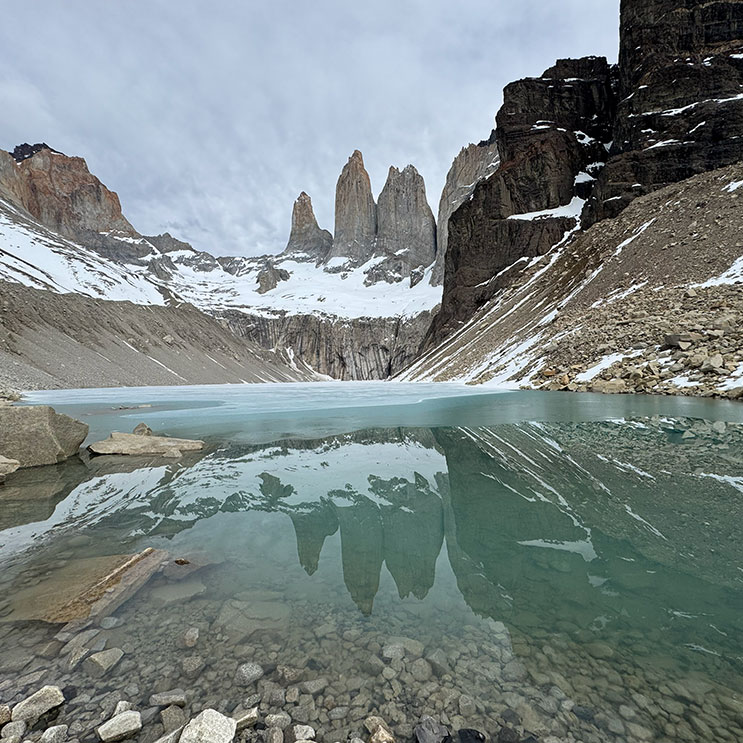 Une fois arrivés au sommet, nous sommes récompensés par l’une des vues les plus magiques de Patagonie : un lac glaciaire turquoise à moitié gelé, surplombé par trois imposantes tours. Sur la rive, nous découvrons même leur reflet dans l’eau calme – un moment qui nous touche profondément et restera longtemps gravé dans nos mémoires. Nous y dégustons notre déjeuner et admirons le paysage grandiose avant d’entamer la descente.