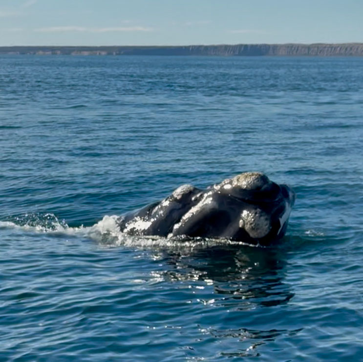 Lors d’une excursion en bateau dans le Golfo Nuevo, nous nous approchons incroyablement près des baleines franches australes. Elles glissent élégamment sous notre bateau, plongent à côté de nous et nous montrent leurs puissantes nageoires – un moment inoubliable.