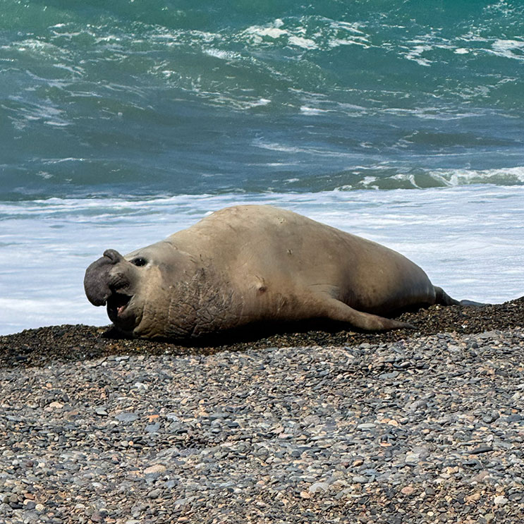 La nuit passée ensuite dans la petite Estancia La Elvira, à l’ambiance familiale, est un véritable moment fort. Accompagnés d’un ranger, nous empruntons un petit sentier qui mène à la plage privée de l’Estancia. Nous y observons de près des éléphants de mer et des lions de mer. Lorsque deux imposants éléphants de mer mâles se livrent à un impressionnant combat à quelques mètres seulement de nous, nous en avons le souffle coupé. Et lorsque, plus tard, nous apercevons même des orques, nous avons du mal à croire à notre chance – de telles rencontres sont extrêmement rares.
