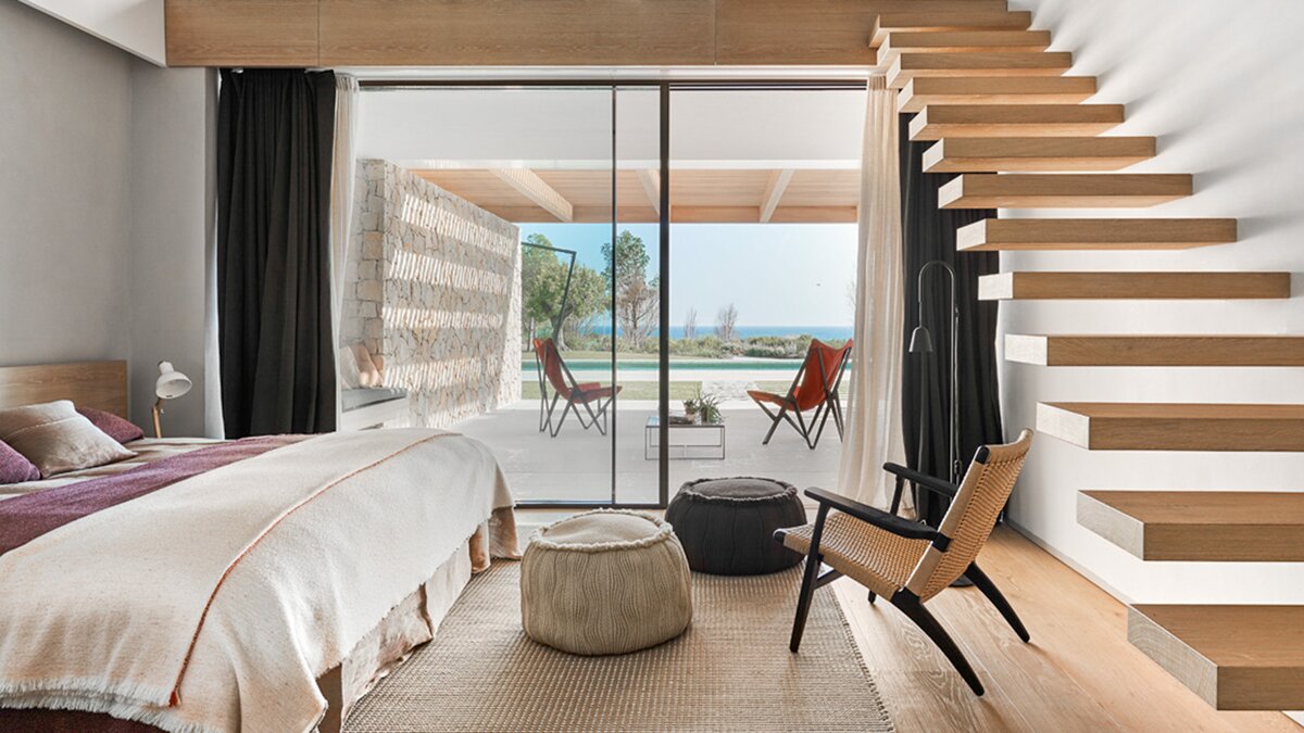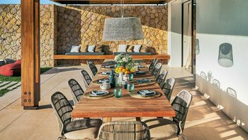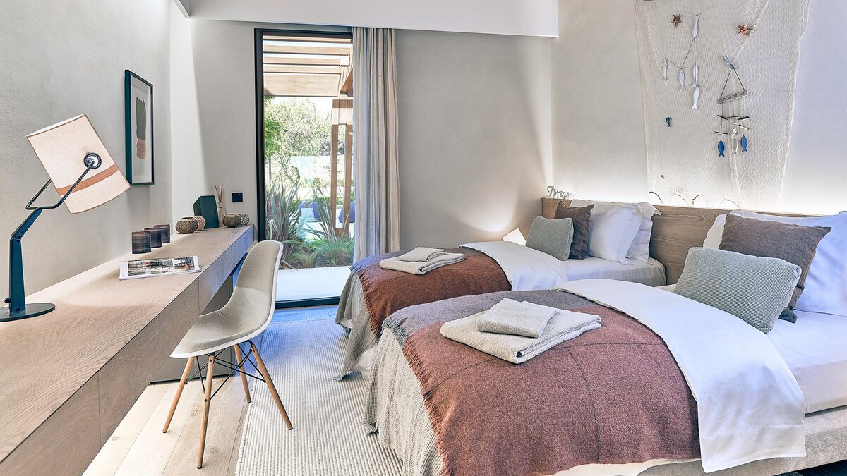 Die Villa verfügt über fünf stilvolle Schlafzimmer, die auf Komfort und Privatsphäre ausgelegt sind. Der Master-Suite verfügt über ein Kingsize-Bett, ein eigenes Bad und ein eigenes Mezzanine-Büro sowie eine große private Terrasse. Zwei weitere Schlafzimmer verfügen über Kingsize-Betten und ein eigenes Bad, während sich die vier und fünf Schlafzimmer ein gemeinsames Bad teilen und mit zwei Einzelbetten und Etagenbetten ausgestattet sind, ideal für Familien oder Gruppen. Jedes Schlafzimmer bietet direkten Zugang zu Patios oder Terrassen, was das nahtlose Wohnerlebnis im Innen- und Außenbereich verbessert.