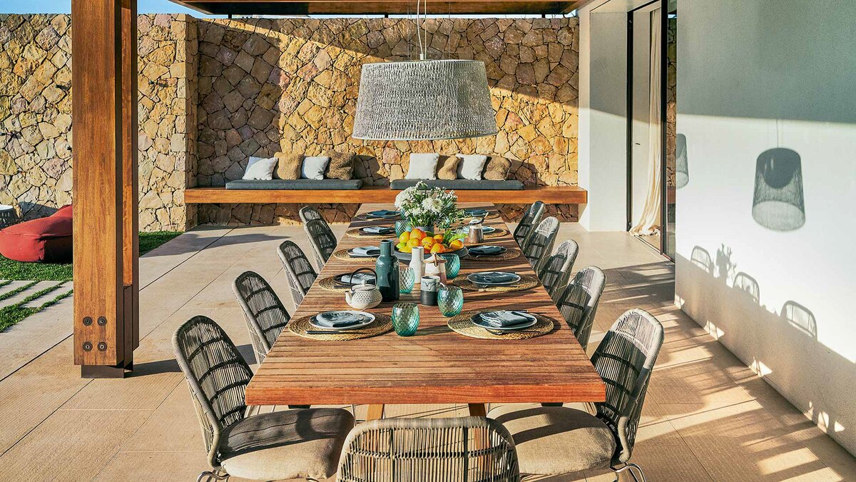 Der geräumige Wohn- und Essbereich des Alfazema verfügt über einen gemütlichen Kamin und öffnet sich auf eine überdachte Terrasse, auf der sich Wohnbereiche im Innen- und Außenbereich nahtlos integrieren lassen. Deren voll ausgestattete Küche schließt sich mühelos an einen Essbereich im Freien an, der ideal ist, um Mahlzeiten im Freien zu genießen.