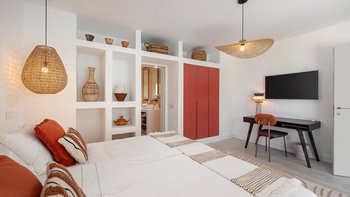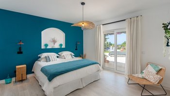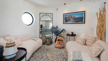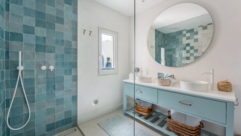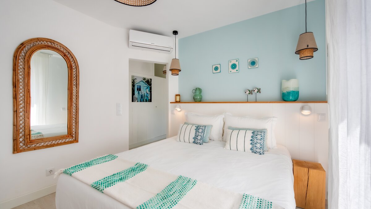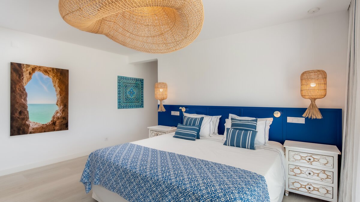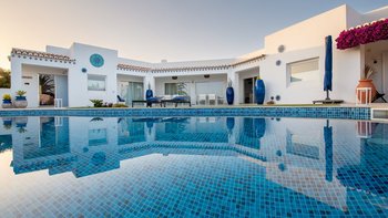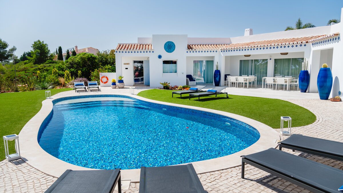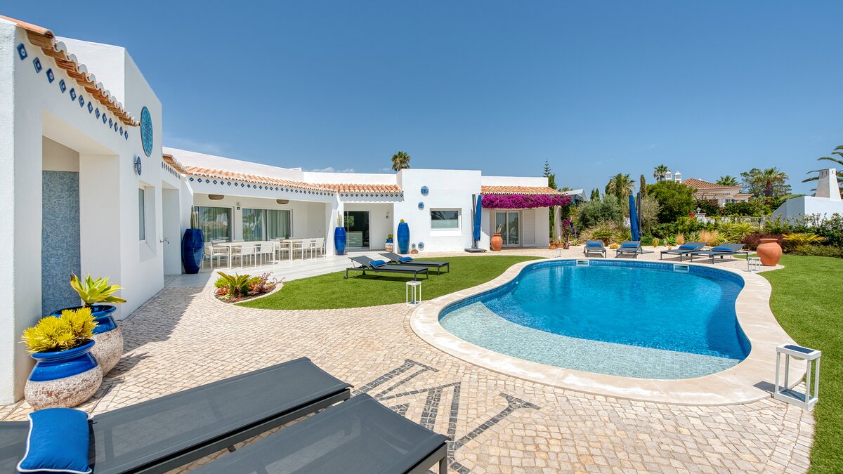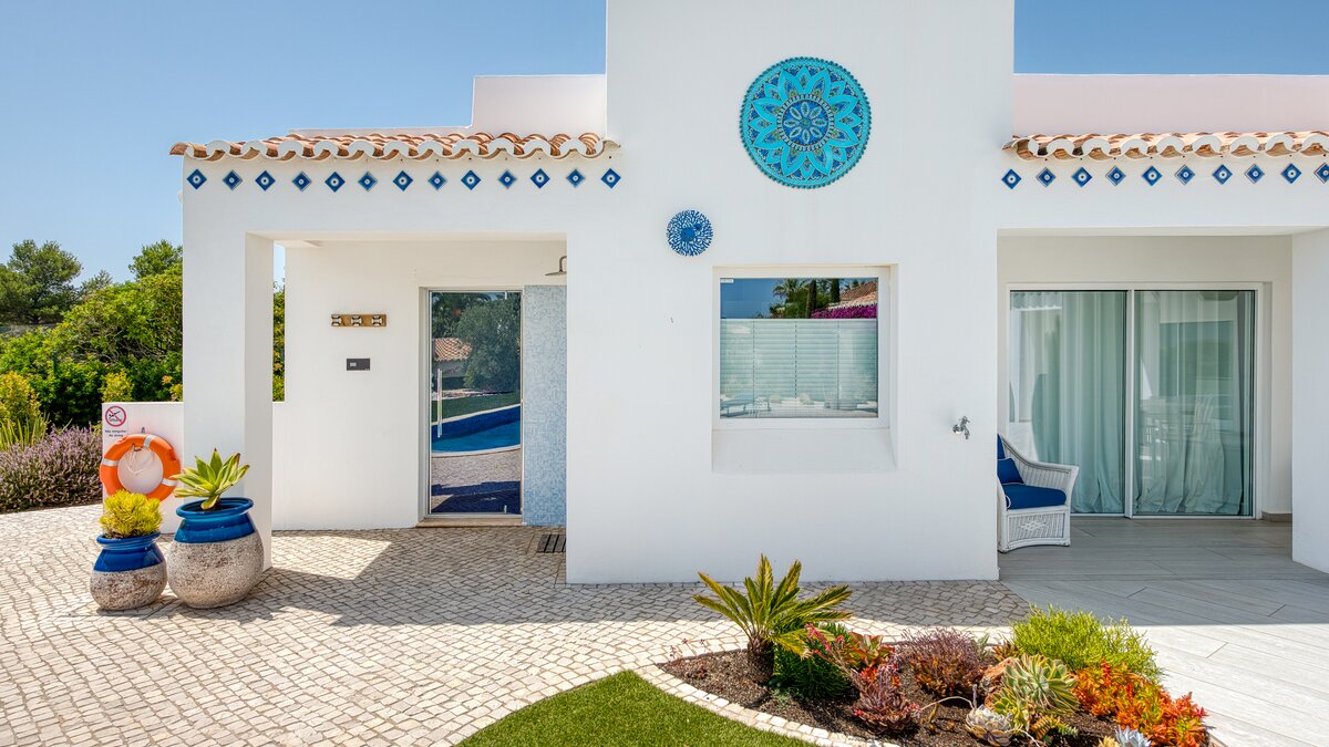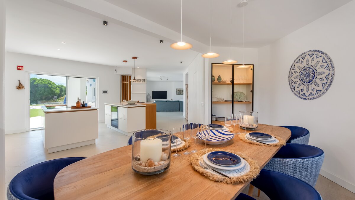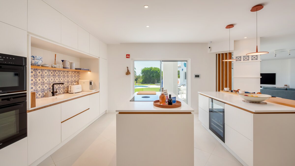 Treten Sie ein und entdecken Sie die geräumigen, lichtdurchfluteten Innenräume, in denen natürliche Materialien und beruhigende Farbtöne die Schönheit der umliegenden Landschaft hervorrufen. Deren Doppelinselküche der Villa und der angrenzende Essbereich fügen sich nahtlos in eine einladende Hauptlounge und ein intimeres Wohnzimmer ein, das sowohl Gemeinschafts- und auch Privaträume bietet. Vier Schlafzimmer mit eigenem Bad, die jeweils nach den Stränden der Region benannt sind (Praia Luz, Paraïso, Falesia, Rocha), sind individuell in beruhigenden Blau-, Türkis- und Ockertönen eingerichtet und bieten entweder Meer- oder Poolblick oder eine abgeschiedene Terrasse. Sorgfältig ausgewählte Möbel, hochwertige Bettwäsche und historische portugiesische Azulejos verleihen dem gesamten Gebäude einen Hauch von Tradition und Komfort und sorgen für ein gemütliches und dennoch anspruchsvolles Ambiente.