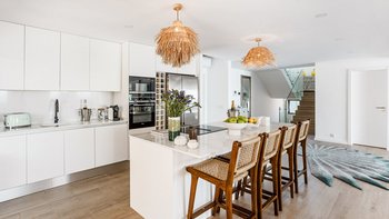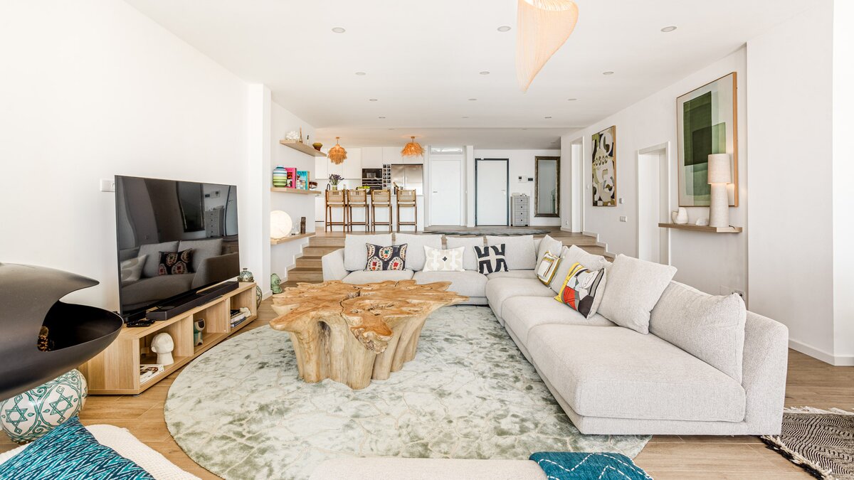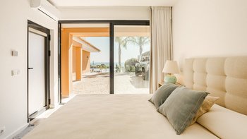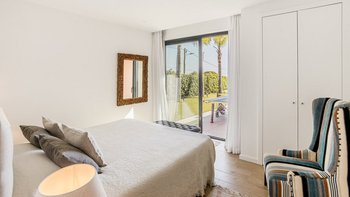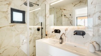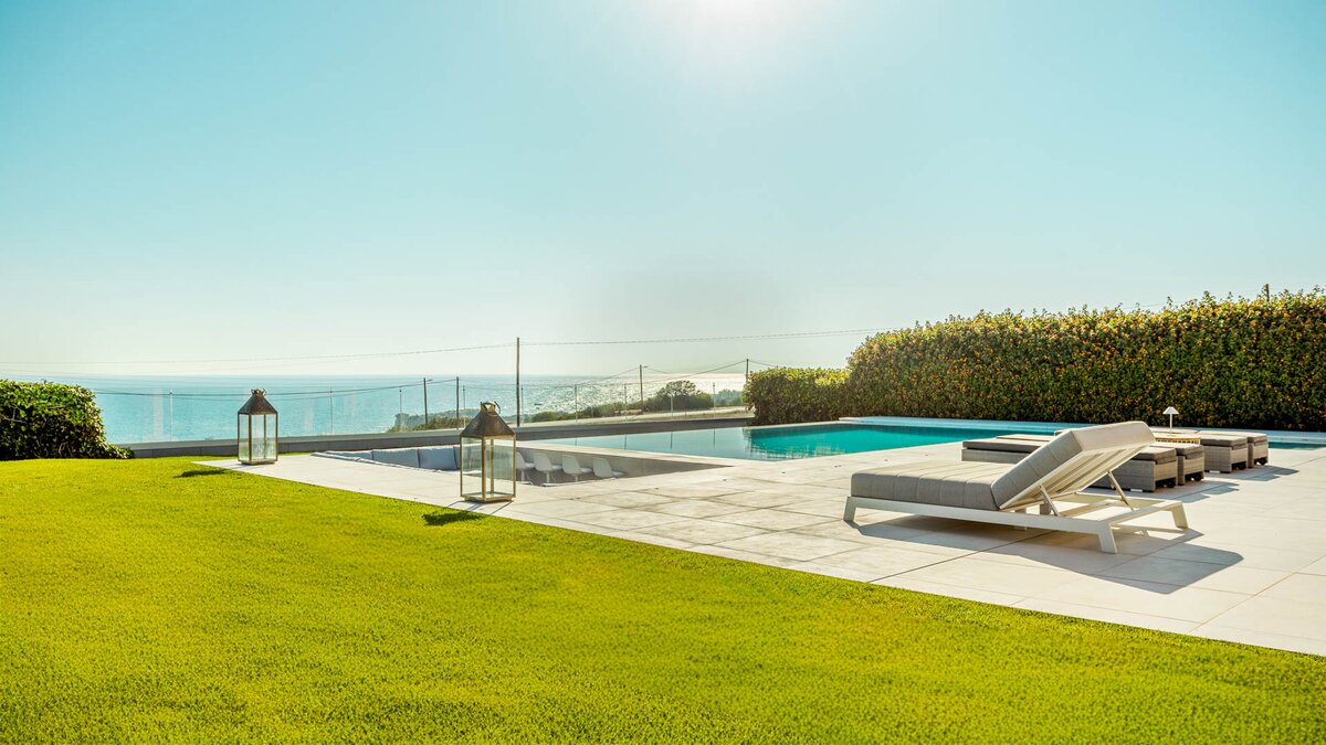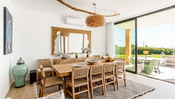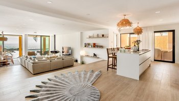 Im Inneren empfängt Sie die Villa mit weitläufigen, lichtdurchfluteten Wohnbereichen, die sich direkt auf die Terrasse öffnen und eine harmonische Verbindung zwischen dem Interieur und der spektakulären Umgebung schaffen. Deren moderne Küche ist komplett für Gourmet-Mahlzeiten ausgestattet, während die geräumigen Ess- und Wohnbereiche ideal sind, um sich mit Freunden und Familie zu unterhalten oder zu entspannen. High-End-Ausführungen und durchdachte Designakzente im gesamten unteren Bereich setzen einen Ton von schlichtem Luxus. Weiters auf dieser Etage befinden sich drei Schlafzimmer, jedes mit eigenem Bad und direktem Zugang zum Außenbereich.