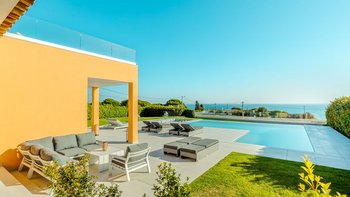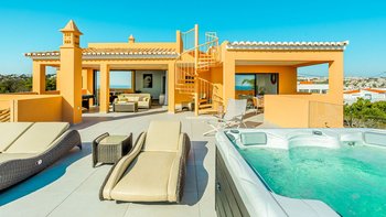Die Außenbereiche sind ein echtes Highlight dieser Villa. Ein spektakulärer Infinity-Pool scheint mit dem Horizont zu verschmelzen und lädt zum Schwimmen ein, während Sie den Blick auf den Atlantischen Ozean genießen. Deren weitläufige Terrasse verfügt über einen Whirlpool, Liegestühle und schattige Sitzbereiche; ideal für Mahlzeiten im Freien oder einfach nur die Sonne der Algarve zu genießen. Deren üppige Landschaft und die freie Aussicht schaffen eine private Oase der Entspannung und Unterhaltung.