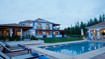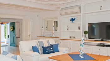Die wunderschöne Villa Ermione liegt privat im Grünen und hinter großen Rasenflächen und ist wie ein Hauch von frischer Luft. Mit Blick auf das Meer aus der oberen Etage und Blick auf das glitzernde Blaue zwischen Palmen und Pinien bietet auch das schicke Interieur ein ausgesprochen maritimes Flair, von Dekor und Möbeln in sanftem Blau und Weißen bis hin zu ausgewählten Artefakten, die die Küste zelebrieren, und einer Klimaanlage, die die salzige Meeresbrise ergänzt. Deren Villa ist sowohl für den Innen- und auch den Außenbereich gut geplant und verfügt über fünf Schlafzimmer mit Bad, die mit erfrischender Einfachheit gestaltet sind; eine geräumige Frühstücksküche, ein elegant übersichtliches Esszimmer und ein kühles, ruhiges Wohnzimmer, das sich auf eine überdachte Terrasse öffnet.