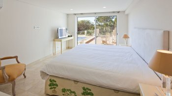 Im Erdgeschoss befindet sich eine große und helle, voll ausgestattete Küche mit einfachem Zugang zum Außengrillbereich. Ein Wohn- und Essbereich mit großen Fenstertüren führt auf die erste Poolterrasse, ein perfekter Ort, um Zeit mit Ihren Gästen zu verbringen. Eines Büro, ein Ankleideraum, zwei Doppelschlafzimmer mit eigenem Bad und ein Hauptschlafzimmer mit eigenem Zugang zur Poolterrasse befinden sich ebenfalls auf dieser Etage.