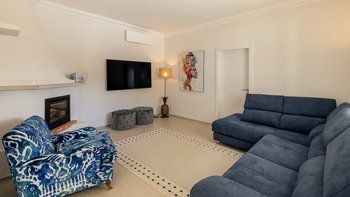 Im Inneren führt die Eingangshalle zu einem geräumigen Wohnbereich, hell mit modernen Akzenten. Dieser Zimmer ist das Herzstück des Erdgeschosses mit französischen Türen, die direkten Zugang zum Außenbereich bieten. Auf dieser Etage befinden sich auch ein TV-Raum und ein Esszimmer, das zur Küche führt, ein elegantes und glorreiches, voll ausgestattetes Zimmer mit einer Inseleinheit und Zugang zum Sitzbereich im Freien, wo die Gäste in der Sonne frühstücken können. In Furhteron gibt es zwei Zweibett-Schlafzimmer, beide mit eigenem Bad und Türen zur Terrasse. Im Obergeschoss befinden sich weitere drei Schlafzimmer, zwei Doppel- und ein Zweibett-Schlafzimmer, alle mit eigenem Bad und Zugang zur Terrasse.