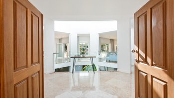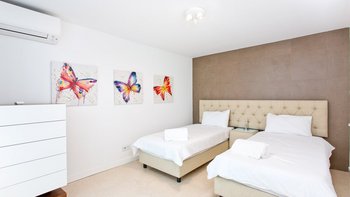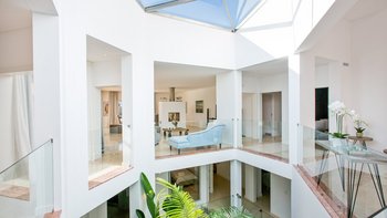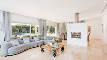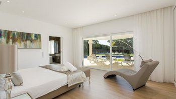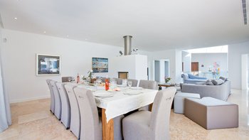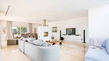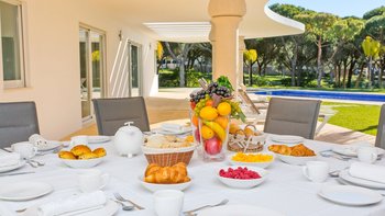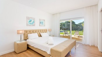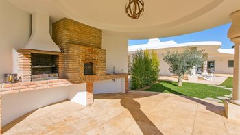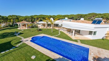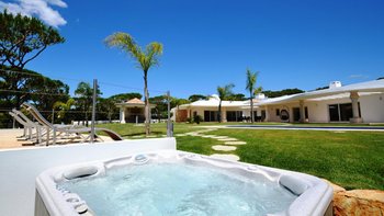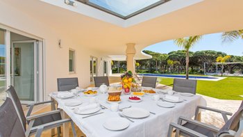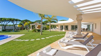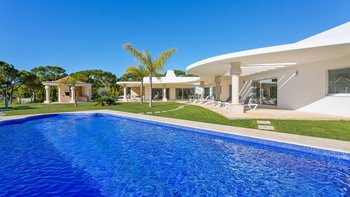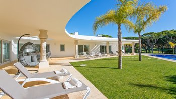 Die schicke, helle und moderne Villa Omar genießt eine beneidenswerte Lage in einer exklusiven Wohngegend, umgeben von den Grünflächen des Golfplatzes. Dessen architektonisches Design hat ein fast futuristisches Flair. Denen geschwungenen, schattigen Terrassen bieten attraktiv eingerichtete Bereiche für Mahlzeiten im Freien und zum Entspannen. Sie blicken auf lange Rasenflächen mit jungen Palmen und mediterranen Pinien. Dies ist die Kulisse für den einladenden Pool der Villa, der mit Mosaikfliesen in markantem Tiefblau gesäumt ist, und für einen eingebauten Grill für ein gemütliches Mittagessen mit der Familie. Die Unterkunft im Erdgeschoss der Villa umfasst ein großes Wohn-/Esszimmer und eine elegante Küche mit Frühstückstheke sowie zwei Doppel- und zwei Zweibettzimmer, jeweils mit eigenem Bad oder Dusche. Im unteren Erdgeschoss befindet sich ein Spielzimmer mit TV und Billardtisch, und es gibt zwei weitere Schlafzimmer, ideal für Kinder. Deren vollklimatisierte Villa befindet sich 6 km von den Restaurants und Geschäften von Vilamoura und 7,5 km vom Yachthafen und dem Strand Praia Falesia entfernt.