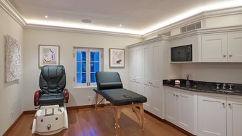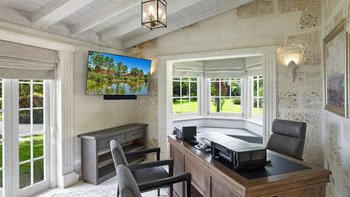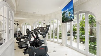 The estate is designed for relaxed indoor-outdoor living, with inviting spaces throughout. Guests can spend their days unwinding in the Pool Pavilion, complete with oceanfront daybeds and shaded seating, or enjoy al fresco dining on the top-floor terrace with its teppanyaki bar and sunset backdrop. A spa, steam room, gym with Peloton Bike, and a tranquil office complete the picture, ensuring both leisure and comfort.