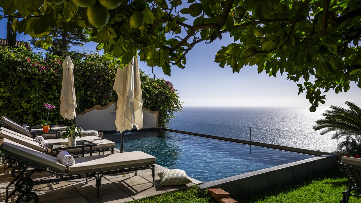 Im Inneren befinden sich fünf Schlafzimmer auf der oberen und unteren Etage, darunter eine geräumige Master-Suite mit eigenem Wohnzimmer und eigener Terrasse. Deren Hauptwohnräume öffnen sich auf eine große Panoramaterrasse, die teilweise schattig ist und von Zitrusbäumen, Palmen und Bougainvillea umgeben ist. Es ist ein einladender Ort, um sich zu entspannen, zu lesen oder lange Mahlzeiten im Freien zu genießen.