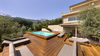 Der schöne Pool nimmt auf der schicken Holzterrasse mit luxuriösen Liegestühlen zum Schlummern am Pool einen Ehrenplatz ein.