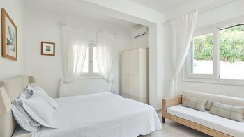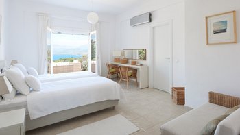 Mit komfortabel eingerichteten Terrassen, die Wohn- und Esszimmer im Freien bilden, und schickem Interieur mit Dekor und Stoffen in sanften Cremetönen, ist dies eine geräumige Familienvilla in einer atemberaubenden Landschaft. Der Erdgeschoss der Villa befindet sich auf drei Ebenen in den Hang und verfügt über eine stilvolle Küche und das große und schöne Wohnzimmer, von dem aus Türen auf die Terrassen und den Pool und Pool führen. Jedes der Schlafzimmer verfügt über eine Klimaanlage und drei haben ein eigenes Bad oder eine Dusche, das erste Stockwerk hat einen doppelten Zugang zu einem privaten Rundum-Balkon, während die Zimmer im unteren Erdgeschoss Flügeltüren zu einer ruhigen Gartenterrasse unterhalb des Infinity-Pools der Villa haben. Tischtennis sorgt für sportliche Unterhaltung; ein im Voraus buchbarer Kochservice könnte zum mühelosen Leerlauf ermutigen; und Spaziergänge durch die umliegenden Olivenhaine sind oft in Begleitung von kleinen Vögeln und Eidechsen, die in ihrer ungestörten Umgebung furchtlos sind. Sinies, 800 m vom Haus entfernt, hat einen ausgezeichneten Dorfladen, Bäckerei und Fischladen. Denen Strände und Tavernen von Avlaki und Kassiopi sind nur 3 km entfernt.