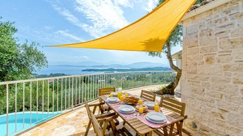 Eine schöne moderne Villa, Moira ist eine gute Wahl für Familien oder Paare, in der Nähe von Kassiopi mit herrlichem Meerblick über Olivenhaine von den charmanten Terrassen und dem wunderbaren Infinity-Pool.