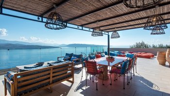 Die Villa Kyvos wurde durchdacht mit Blick auf die Aussicht entworfen und bietet einen atemberaubenden Blick über das Meer bis nach Albanien von fast überall im Haus. Nur einen kurzen Spaziergang vom exklusiven St. Stephano mit seiner Auswahl an ausgezeichneten Tavernen sowie dem schönen Kieselstrand von Kerasia entfernt, ist diese moderne Luxusvilla perfekt für einen erholsamen Urlaub und gut ausgestattet für Unterhaltung. Im Erdgeschoss befinden sich die moderne Küche und der Wohn-/Essbereich, die in einem eklektischen zeitgenössischen Stil eingerichtet sind, und öffnen sich zum schillernden Infinity-Pool und der umlaufenden Terrasse, die zu einem Esstisch mit Grillplatz führt. Ebenfalls auf dieser Etage befindet sich das Hauptschlafzimmer mit Zugang zur Terrasse und mit Bad en suite. Es gibt vier Schlafzimmer im ersten Stock, ein Doppel- und drei Zweibett-Schlafzimmer, alle mit Duschen en Suite und separaten WCs en Suite. Jedes Zimmer auf dieser Etage hat Blick auf das Meer und jedes hat Zugang zu einem kleinen Balkon. Ein echtes Highlight ist die spektakuläre Dachterrasse mit Panoramablick entlang der Küste, einer gut ausgestatteten Sommerküche und einem schönen schattigen Essbereich, um bei Sonnenuntergang das Abendessen zu genießen.