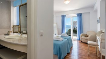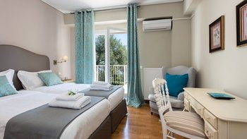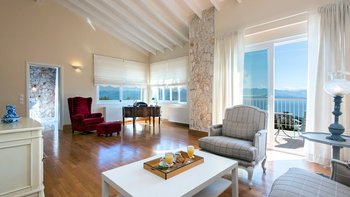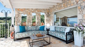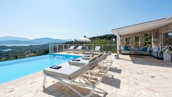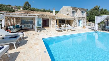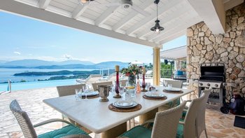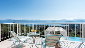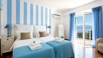 Die drei Schlafzimmer im Erdgeschoss sind individuell gestaltet und alle mit Klimaanlage ausgestattet. Jedes der drei Schlafzimmer im Erdgeschoss verfügt über ein eigenes Bad mit Dusche. Das Haupt-Doppelzimmer befindet sich in privater Lage auf der oberen Ebene und verfügt über einen eigenen Balkon mit Blick auf die herrliche Aussicht. Draußen gibt es eine große, große und schön eingerichtete Terrasse mit einem geschützten Essbereich, einem Wohnzimmer im Freien in einer Pergola mit Vorhängen und dem einladenden Infinity-Pool; alle blicken auf das Blaue der Bucht, über die versilberten Olivenhaine und die roten Dächer von Kassiopi, nur 1,5 km entfernt.