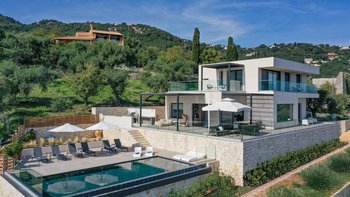 Die Villa Lefkothea liegt auf einem Hügel zwischen zwei Buchten und bietet Panoramablick auf die Stadt Korfu, das Ionische Meer und die Berge Albaniens.
