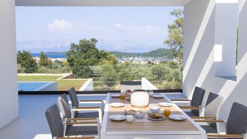 Das Otos liegt oberhalb von Nidri und bietet einen weiten Blick auf das Meer. Es ist ein moderner Rückzugsort für ein entspanntes Leben.