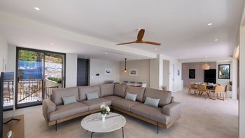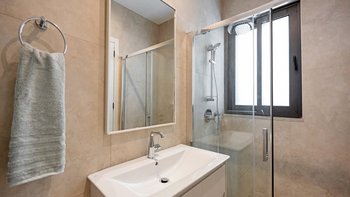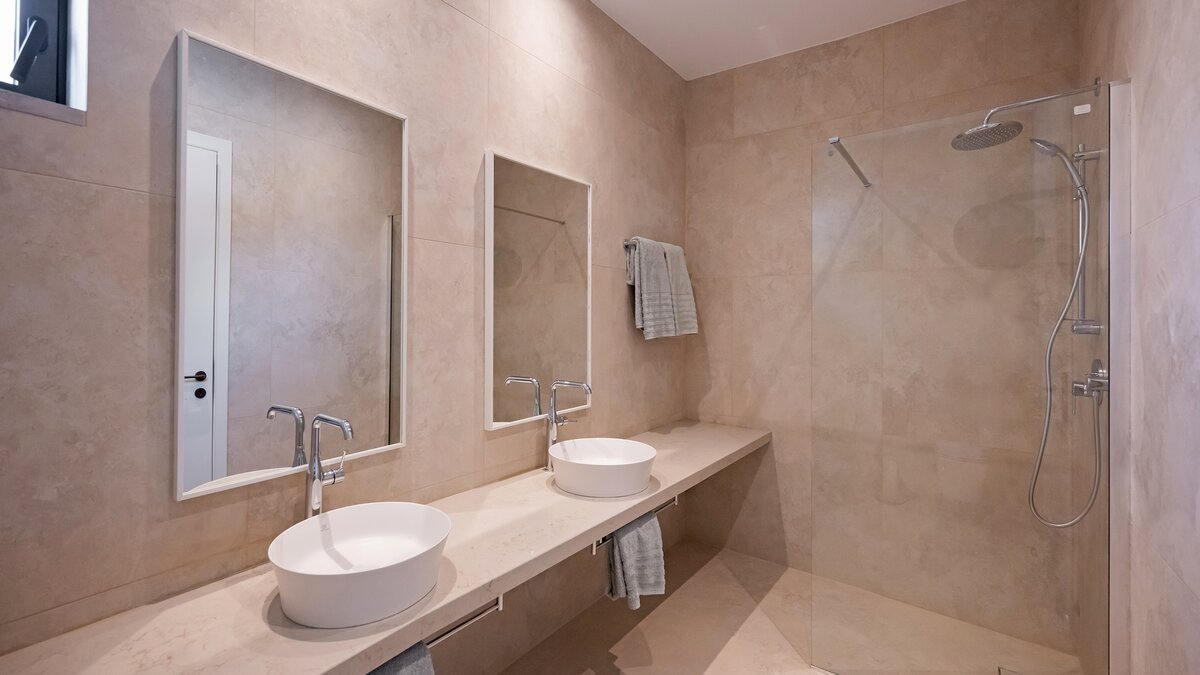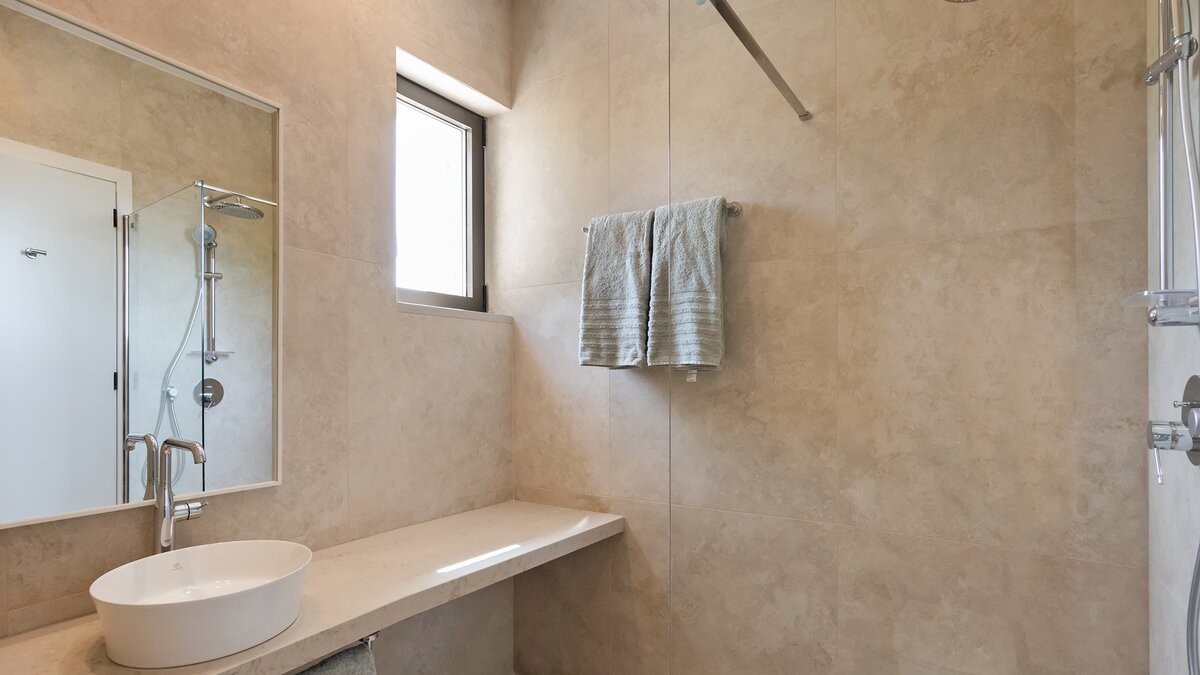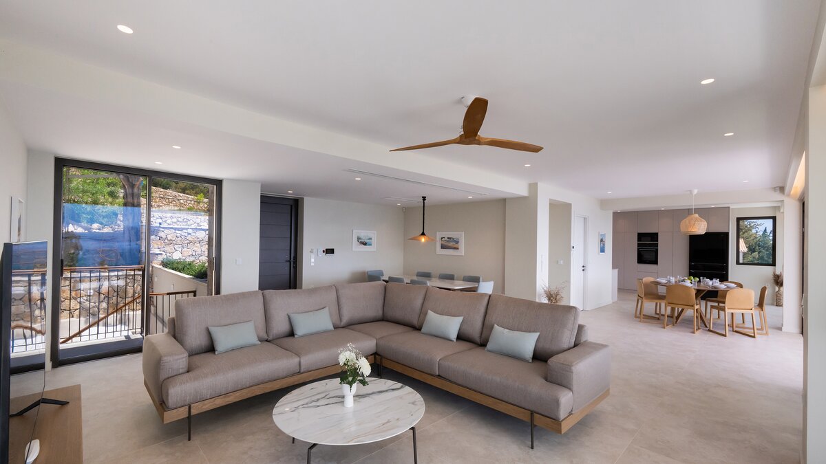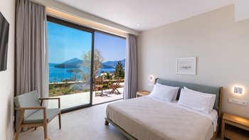 Jedes der fünf Schlafzimmer der Villa Odessa im unteren Erdgeschoss verfügt über ein eigenes Bad mit ebenerdiger Dusche, Zugang zur Terrasse über die Balkontüren und wurde elegant mit massiven Eichenholzmöbeln und natürlichen Stoffen eingerichtet. Der OFFENER GRUNDRISS Wohn- und Küchenbereich im Erdgeschoss öffnet sich auf die Terrasse, wo Sie sowohl Mahlzeiten im Freien genießen und auch entspannen können, bevor Sie die atemberaubende Aussicht genießen, die Lefkada zu bieten hat.