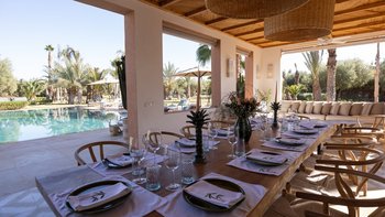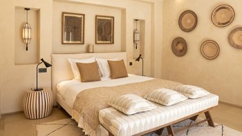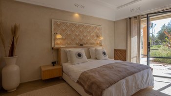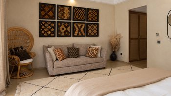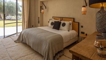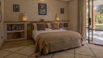 Im Inneren des Haupthauses befindet sich ein luftiger, offener Wohn- und Essbereich mit TV-Bereich, der auf die Terrasse hinausreicht; ein weiterer Fernsehraum bietet einen gemütlichen Ort für Filmabende. Deren Hauptsuite verfügt über ein Badezimmer en suite; ein weiteres Doppelzimmer verfügt über ein elegantes Duschbad en suite und drei weitere Schlafzimmer en-suite runden die Unterkunft ab. Ein besonderes Highlight ist die Gastronomie: Dessen hauseigenes Team kreiert individuelle Menüs, die duftende marokkanische Aromen mit europäischen Favoriten vermischen, oft mit Produkten aus dem großzügigen Gemüsegarten.