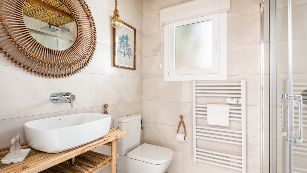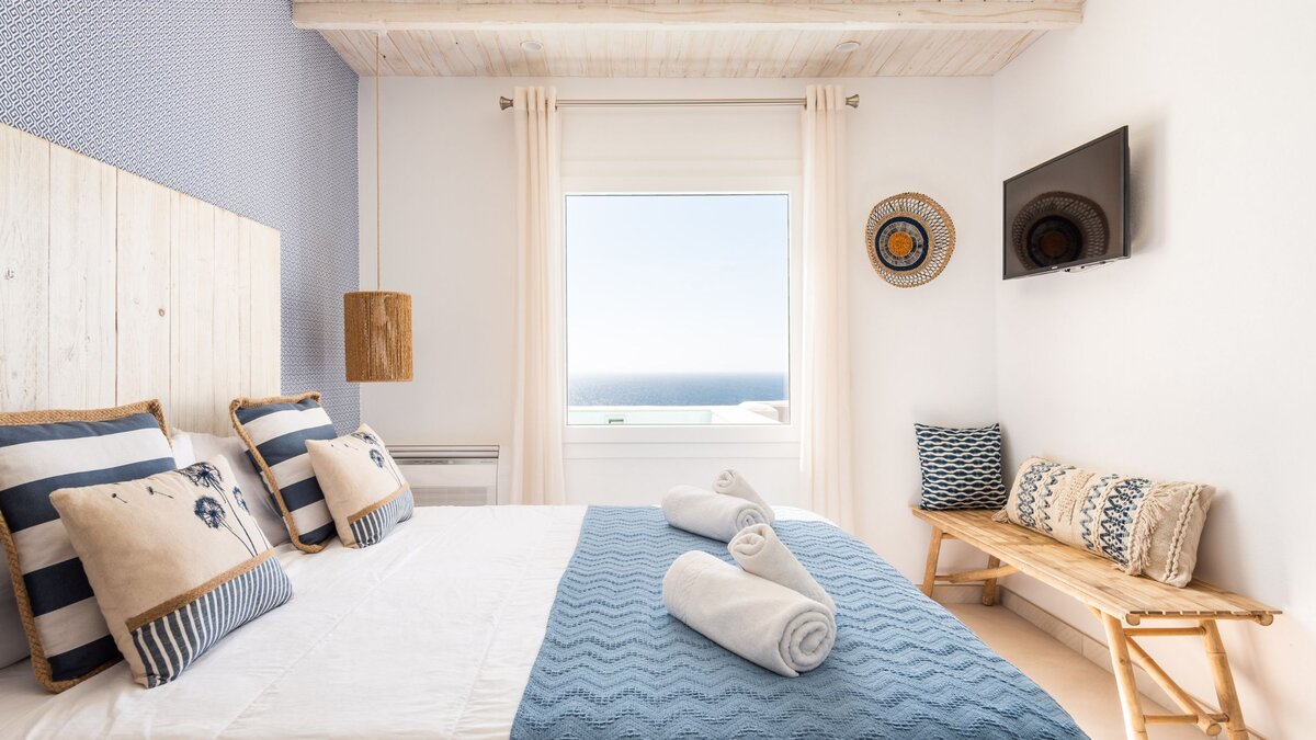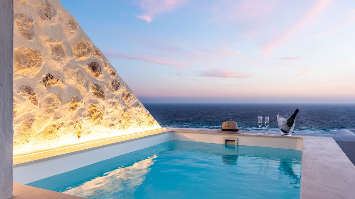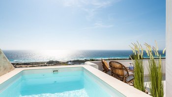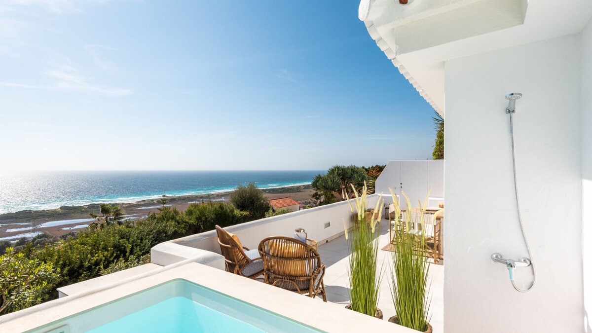 Im Außenbereich ist die private Terrasse der eigentliche Blickpunkt. Von hier aus erstreckt sich der weitläufige Blick auf das Meer, am besten vom eigenen Tauchbecken (2m x 1m) genossen werden, wo Sie sich erfrischen und die Landschaft bewundern können. Egal, ob Sie den Tag mit einem Kaffee beginnen oder mit einem Drink bei Sonnenuntergang ausklingen lassen, die Terrasse lädt zum Verweilen im Freien ein. Ein regelmäßiger Reinigungsservice mit frischen Handtüchern alle zwei Tage sorgt für einen angenehmen und unbeschwerten Aufenthalt.