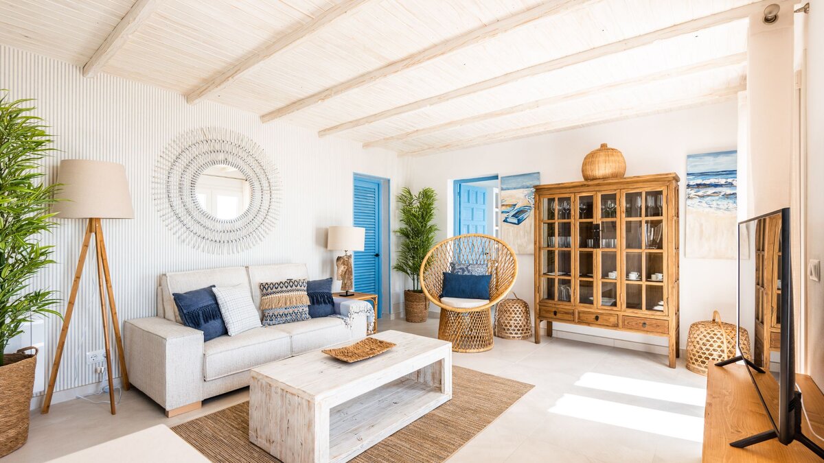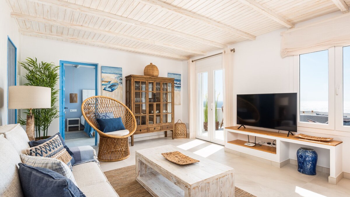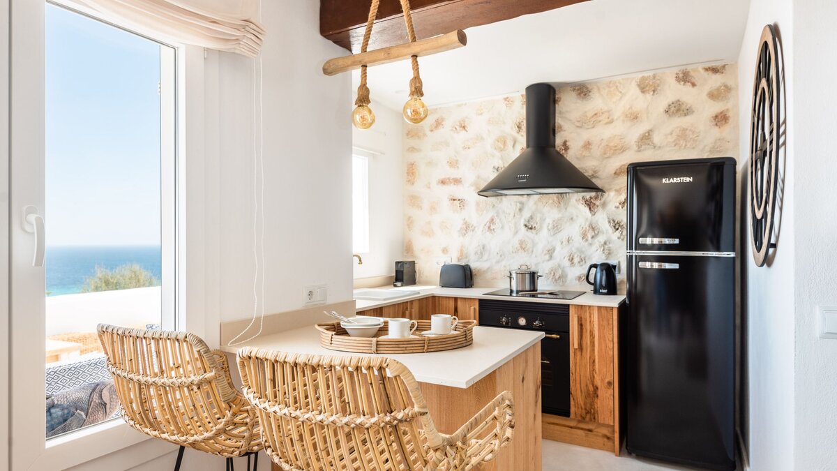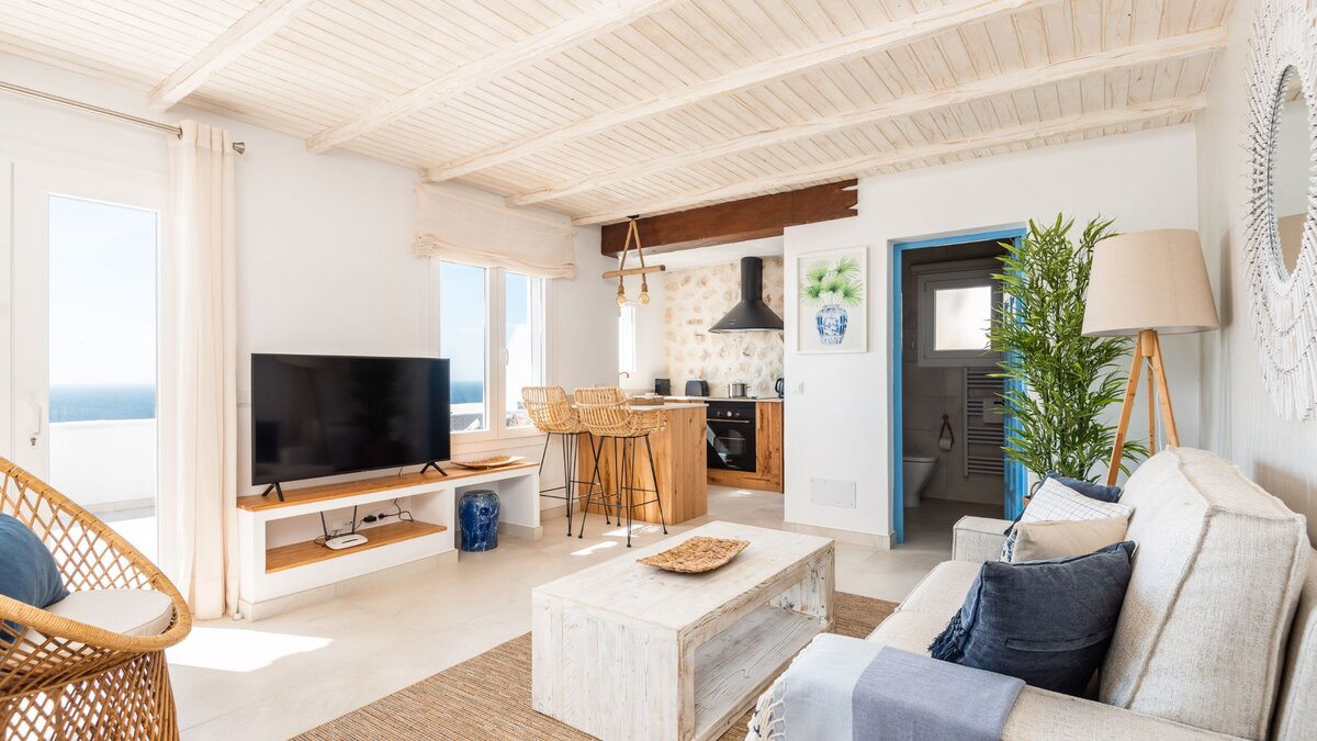 Im Inneren ist die Suite hell und gut angelegt, mit einem offenen Wohn- und Essbereich, der nahtlos in eine voll ausgestattete Küche übergeht, ideal für ein entspanntes Frühstück oder einfache Abendessen. Des Schlafzimmer mit Doppelbett ist ruhig gelegen und verfügt über ein modernes Bad mit Dusche, das einen erholsamen Ort zum Entspannen nach einem Tag in der Sonne schafft. Moderne Möbel und klares Design verleihen den Innenräumen eine helle, luftige Atmosphäre.