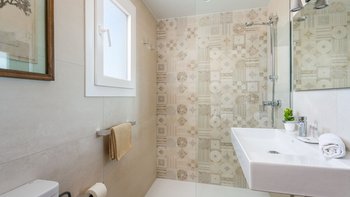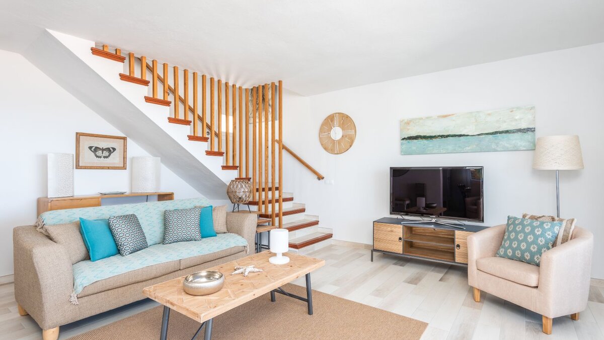 In der UNTERE ETAGE befindet sich das dritte Schlafzimmer mit zwei Einzelbetten und eigenem Bad neben einem geräumigen und lichtdurchfluteten Wohnbereich. Große Glasschiebetüren führen auf eine überdachte Terrasse mit einem Essbereich im Freien und einem einladenden Chill-out-Bereich mit Blick auf die Küste von Son Bou. Der Wohnbereich verfügt zudem über einen Smart-TV mit Internetzugang und eine IPTV-Box mit einer Auswahl an internationalen Kanälen. Deren moderne, offene Küche ist komplett ausgestattet und wird durch eine praktische Essecke ergänzt.